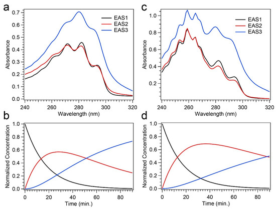 Figure 4). However, for the 258 nm illuminated solutions, a clear decrease in Tachy is found along with a slight increase in Pre-D and Pro-D concentrations. These results are consistent across all other detection wavelengths in the DADS as shown in