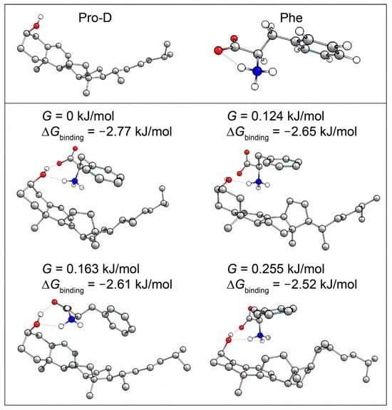 Supplementary Material in Figure S3. We find a [Pre-D]:[Tachy] ratio of 1.96 and 1.92 for the Pro-D and 1:1 Pro-D:Phe mixtures, respectively, at 294 nm excitation wavelength, yielding a percent difference of −1.89%. However, for solutions illuminated at 258 nm, a [Pre-D]:[Tachy] ratio of 0.36 and 0.458 were found, respectively, yielding a +27.2% difference in favor of Pre-D in the mixture. Taking these results together, it would seem that the presence of Phe enables a reduction of Tachy generation, or at least a slowdown of Tachy formation prior to reaching a photostationary state. The outcome is, therefore, a simple form of “photoprotection” of the metastable Pre-D intermediate necessary for eventual vitamin D formation. The potential mechanism of this photoprotection is explored in what follows.