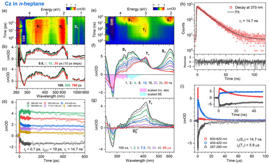Time-resolved optical spectroscopy of carbazole (Cz) in n-heptane at 296 K (λpump = 260 nm for fs-TA, λpump = 266 nm for ns-TA and λpump = 273 nm for TCSPC). (a) fs-TA spectra for the time range up to 700 ps shown as a contour plot. (b,c) fs-TA spectra for selected time windows. (d) Kinetic traces and fits at selected wavelengths obtained from the fs-TA data. (e) Contour plot of ns-TA spectra. (f,g) ns-TA spectra at selected times, including the inverted and scaled steady-state absorption spectrum (magenta) and the steady-state stimulated emission spectrum (cyan). (h) TCSPC signal (red symbols) obtained using a bandpass filter centered at 370 nm, including a monoexponential fit with a small constant offset (black) and fit residuals (lower panel). (i) Kinetic traces and fits of the ns-TA data for the wavelength ranges 600–620 nm, 400–420 nm and 287–290 nm, where S1, T1 and ground-state bleaching, respectively, have dominant contributions (cf. panels (f,g)). The time constants τ1 and τ2 represent the total lifetimes of the S1 state and the T1 state, respectively. The constant offset arises from the long-lived carbazole radical cation (D0•+, cf. panel (g)).
