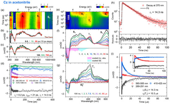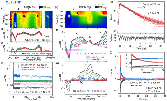 On even longer time scales (panel g), the S1 ESA bands have disappeared and a new ESA band near 420 nm has built up, which is assigned to the T1 state [22,23,37,54]. It decays on the time scale of several microseconds. Kinetic traces extracted from the nanosecond transient absorption data are compared in panel i of Figure 2 for three wavelength ranges: 600–620 nm (red, predominantly decay of S1), 400–420 nm (blue, mainly formation and decay of T1) and 286–290 nm (black, mainly GSB and thus recovery of S0). The kinetic analysis in panel i demonstrates that the time traces in the nanosecond transient absorption signals are well reproduced by biexponential fits, with a time constant of 14.7 ns for the formation of T1 via intersystem crossing (ISC) from S1, and a time constant of 5.9 μs for the lifetime of T1 (τ2 = k2−1). Note that the time constant of 14.7 ns obtained from the fit to the ns-TA experiments agrees with the S1 lifetime found in the TCSPC measurements in panel h. In addition, a long-lived, weakly absorbing species with a broad spectrum was observed (340–660 nm, cf. panel g at 85 μs). We propose that this spectral feature arises from the Cz•+ radical cation (doublet ground state, D0•+). First of all, it strongly resembles the flat steady-state absorption spectrum of Cz•+ reported by Shida et al., which was obtained by exposing Cz in an organic matrix at 77 K to γ radiation [55]. Secondly, the vertical ionization energy of Cz was previously reported as 7.68 eV (161 nm) [56]. Therefore, resonant two-photon ionization of Cz via the Sx state by our pump laser pulse at 266 nm will be energetically feasible. The radical cation lives longer than the time window covered in the ns-TA experiments, and thus only a lower limit can be given for its lifetime τRCat.