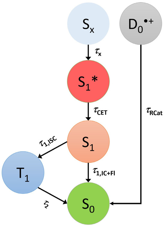 The current results for “isolated” Cz and t-Bu-Cz molecules in organic solvents provide relevant photophysical and kinetic data for the interpretation of their electronic contributions in more complex environments, such as carbazole-based thin film materials or blue-emitting TADF compounds employing Cz-type derivatives as electron donor group [6,9,61,62], where competing channels, such as, for example, ICT processes, singlet–singlet, singlet–triplet and triplet–triplet annihilation take place simultaneously. For instance, the energetic position of the S1 state of the Cz-type donor relative to the electronic states in the acceptor part of modern TADF dyes is relevant to the efficient transfer of the initial excitation to the acceptor. Moreover, the high-lying S1 and T1 states of carbazole-based host materials are of general importance for OLED operation, as the light-emitting states of the guest molecule are not subject to quenching by triplet energy transfer to the host.