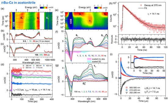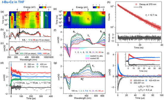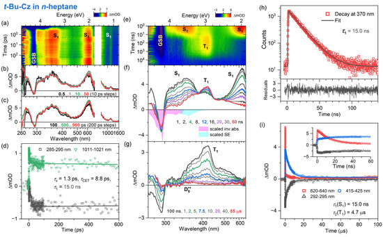Time-resolved optical spectroscopy of 3,6-di-tert-butylcarbazole (t-Bu-Cz) in n-heptane at 296 K (λpump = 260 nm for fs-TA, λpump = 266 nm for ns-TA and λpump = 273 nm for TCSPC). Arrangement of the panels as in Figure 2.