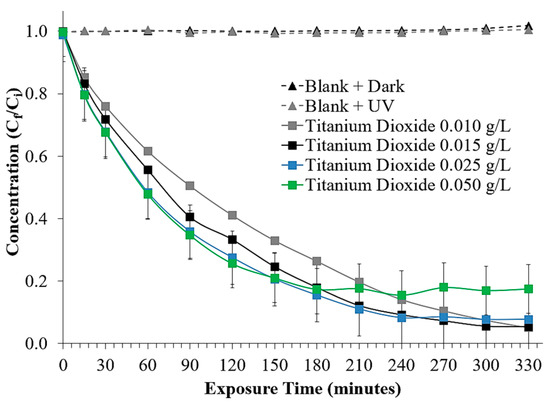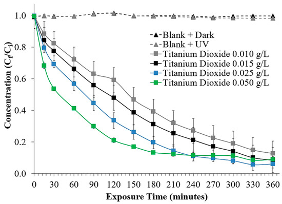 The catalyst concentration plays an important role in the photocatalytic capacity of TiO2 nanoparticles. Increasing the catalyst concentration promotes greater generation of ROS initially, resulting in enhanced dye photodegradation. However, the concentration of the catalyst is not the only parameter that affects the photocatalysis processes. In Figure 2, Figure 3 and Figure 4, it is evident that in the early stages, TiO2 at high concentration (0.050 g/L) promotes fast degradation. However, after the reaction is stopped and in the final stages of the degradation process, lower concentrations of TiO2 demonstrate greater efficiency. Since the light intensity, illumination time, and concentrations of oxygen, among other parameters, remain constant during the entire process, this leads to decreased efficiency of photodegradation at higher catalyst concentrations (0.050 g/L of TiO2). It is known that the generation of ROS depends on the oxygen concentration in the solution. Higher concentrations of oxygen and catalyst will promote more generation of ROS. In this case, the concentration of oxygen was constant for all TiO2 concentrations, which did not promote a high production of ROS at high concentrations of TiO2 [22].
