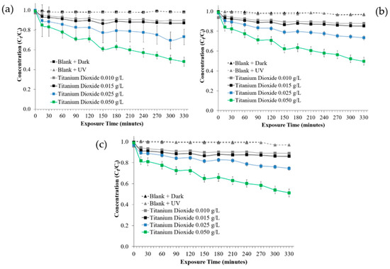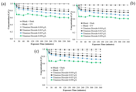 Photocatalytic activity of TiO2 NPs at four concentrations (0.010, 0.015, 0.025, and 0.050 g/L) for the degradation of (a) Amaranth, (b) Methyl Orange, and (c) Quinoline Yellow in the multicomponent experiments using tap water.