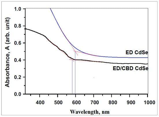 The absorption spectra for the ED CdSe and ED/CBD CdSe thin-film layers were recorded in the solid state, as shown in Figure 3. The absorption spectrum of the ED/CBD CdSe layer exhibited a well-defined absorption edge at approximately 580 nm, indicating a reduction in particle size. Conversely, the ED CdSe layer showed an absorption edge at 598 nm, suggesting the formation of larger particles. These absorption edges are characteristic of CdSe films. The Tauc plot [37], shown in Figure 4, was plotted as αhν versus hν, where α is the absorptivity, h is the Planck constant, ν is the frequency, and n = ½ for direct allowed electronic transitions. This provides a Tauc plot for the estimation of the band gap energy through the extrapolation of the linear part to the hν axis. Figure 4 displays the Tauc plot, which is a visual and analytical method for analyzing the bandgap of CdSe thin films. Estimations from this plot show that the CdSe electrode has an approximately 2.10 eV band gap for the ED CdSe layer, indicating larger particle size. Conversely, the ED/CBD CdSe layer shows a 2.14 eV band gap, indicating the formation of smaller particles. The Tauc results are in very good agreement with the literature values [6,38]. This value corresponds to the standard expected bandgap for CdSe since it is a direct bandgap. The bandgap of a CdSe thin film is important for understanding its electronic and optical features because it will directly impact its applicability for use in optoelectronic devices, including solar cells. Accurate estimation of the bandgap may enable better tuning of the features of the material and increase the performance of devices using such CdSe films. The absorption spectra and Tauc plot provide insight into the optical features of CdSe thin films, allowing estimations of the energy of the band gap and its use in optoelectronic devices.