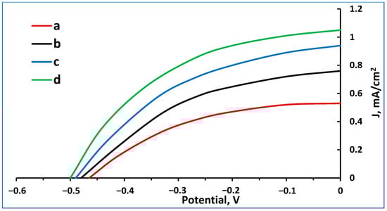 Plots of the photocurrent vs. applied potential for CdSe film electrodes at different redox couple concentrations: (a) 0.05 M, (b) 0.10 M, (c) 0.15 M, and (d) 0.20 M NaOH or Na2S.
