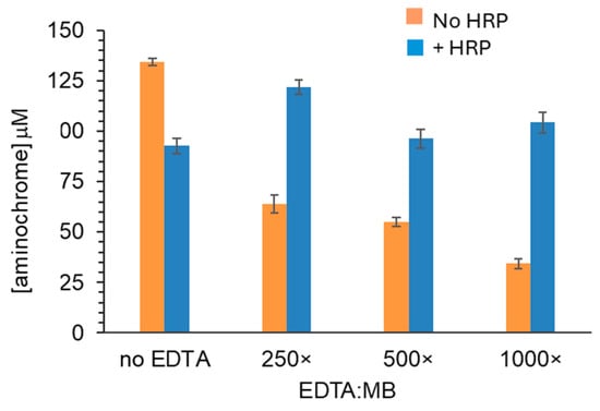 Figure 1 also shows that the inclusion of EDTA led to a dose-dependent decrease in AC yield, consistent with our prior work (−HRP). Even though less AC was produced, H2O2 production was not halted by EDTA. For all EDTA concentrations tested, the yield of H2O2 was greater than if no EDTA was present. High ratios of EDTA to MB were critical to ensure the transfer of electrons from EDTA to MB so that MB continues to photoreduce additional o-quinone intermediates.