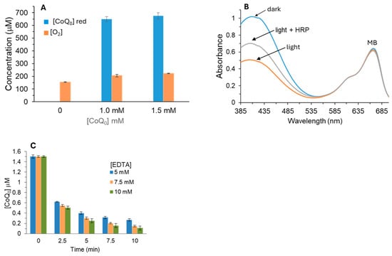 Figure 2B shows UV/Vis scans of CoQ0 photoreduction reactions before irradiation after 5 min of red light and for light samples with added HRP. Following irradiation, the peak at 405 nm corresponding to CoQ0 decreased due to photoreduction. When HRP was added, some absorbance at 405 nm was restored. If catalase was added prior to HRP, no increase in absorbance was detected because catalase consumes the requisite H2O2 (Equation (2)). No changes at lower wavelengths were observed. The second peak at ~665 nm corresponds to MB, and no photobleaching occurred after 5 min of light exposure. No oxygen uptake was observed for MB and CoQ0 in the absence of EDTA. This result confirms that H2O2 was produced during CoQ0 photoreduction under ambient oxygen.