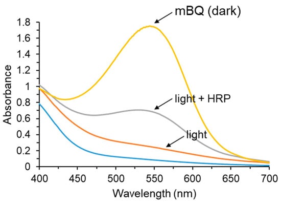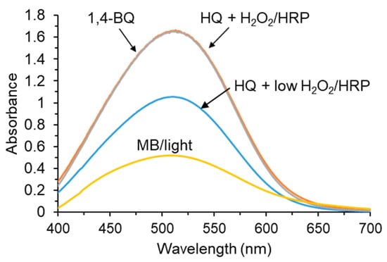 Figure 5 shows that the visible spectrum of the DNP adduct of authentic 1,4-BQ is identical to that of 1,4-HQ treated with H2O2 and HRP. As expected, the extent of 1,4-HQ oxidation was dependent on the concentration of H2O2 (blue curve). When 1,4-HQ was photo-oxidized with MB and red light under ambient oxygen and subsequently modified with DNPH, the same DNP adduct was produced (yellow curve).