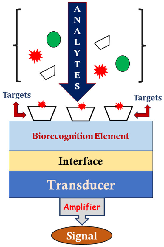 A biosensor is a device combining a biological recognition element like nucleic acid, antibody, enzyme, etc., with a transducer to detect analytes through optical, electrochemical, or mechanical systems [91,92]. The recognition element interacts with the analyte, and the transducer converts this interaction into an electrical signal for further analysis. Biosensors serve as artificial receptors, similar to human sensory organs, detecting specific stimuli and transmitting signals. They are precise or highly specific, capable of sensing even low analyte concentrations, and have diverse applications, including DNA manipulation, drug development, security, clinical diagnostics, healthcare monitoring, food quality control, and environmental monitoring [93,94,95]. Selectivity is crucial for biosensors to detect target analytes in complex samples, minimizing false positives. Antibodies use binding domains, enzymes rely on specific pockets, and nucleic acids face reduced selectivity from electrostatic interactions, addressable with peptide nucleic acids. Biosensor sensitivity measures the signal response to changes in analyte concentration, with detection limits defining the range. High sensitivity allows responses to minor concentration fluctuations, often in the pico- to nanomolar range. The reproducibility of biosensors is the ability to consistently produce the same results for a sample, defined by precision and accuracy. Antibodies and enzymes, sensitive to pH and temperature, face reproducibility challenges, especially in low-resource settings. Aptamers, polymers, and some specific nanoformulations offer highly reproducible outcomes, benefiting from cost-effective and consistent chemical synthesis. The stability of biosensors, critical for continuous monitoring, depends on bioreceptor affinity and resistance to degradation over time [96,97]. The structure and construction of biosensors are shown below in Figure 1.