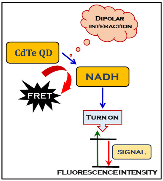 With reference to the categorization of biosensors, the optical biosensors or “Optopodes” is one of the simplest in terms of construction, working, and versatility. Optical biosensors, being hyphenated, integrate an optical technique with a biological element to identify the required chemical or biological species. Optical biosensors are mainly developed based on surface plasmon resonance and optical spectroscopy, such as luminescence, fluorescence, phosphorescence, etc. [98]. Fluorescence-based optical biosensors rely on different photo processes like CT, PT, ET, etc., for signal transduction. In this connection, it is pertinent to state that biosensors based on changes in fluorescence intensity are the most accepted and universally used owing to their sensitivity, simplicity, and adaptability for different measurements [99]. One example is the transfer of energy through the routing of fluorescent signals from NADH to quantum dots (QDs), which has been a comprehensive subject of extensive research for Fluorescence Resonance Energy Transfer (FRET) -based applications. The dipolar interaction between CdTe QD and NADH may lead to an efficient energy transfer, enhancing the fluorescence intensity of the QD and the subsequent quenching of the fluorescence of tagged NADH [100]. The mechanistic procedure is shown in Figure 2.