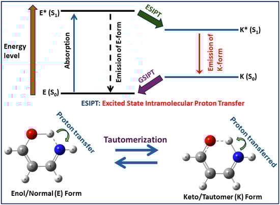 ESIPT, on the other hand, proceeds within the same molecule along a preformed hydrogen bond. ESIPT takes place in a molecule when the acidic or basic part of it becomes stronger in the excited state, which ultimately leads to the formation of a tautomer. This takes place via the formation of an intramolecular hydrogen bond between the two moieties that provide the doorway for the intramolecular proton transfer process, as shown in Scheme 1. The photo-tautomers are usually formed in the excited state and relax quickly to the ground state (non-emissive) or fluoresce with a large Stokes-shift (emissive). Generally, ESIPT reactions are followed by the rise and decay of the strong Stokes-shifted fluorescence of the tautomer produced through the ESIPT process [41,42,43,44,45].