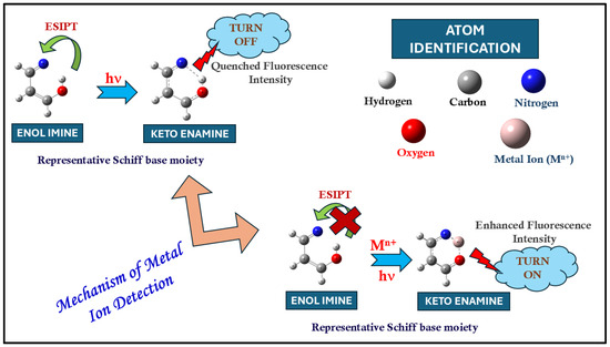 Schiff bases with ESIPT characteristics present enhanced selectivity towards binding metal ions and establish themselves as excellent sensor materials for the detection of such metal ions. Metal detection approaches can broadly be classified into two types: ‘recognition’ and ‘reactivity’, as exemplified by Aron et al. [115]. The general mechanism of identification/sensing metal ions by ESIPT-based Schiff bases can be represented by Scheme 3.