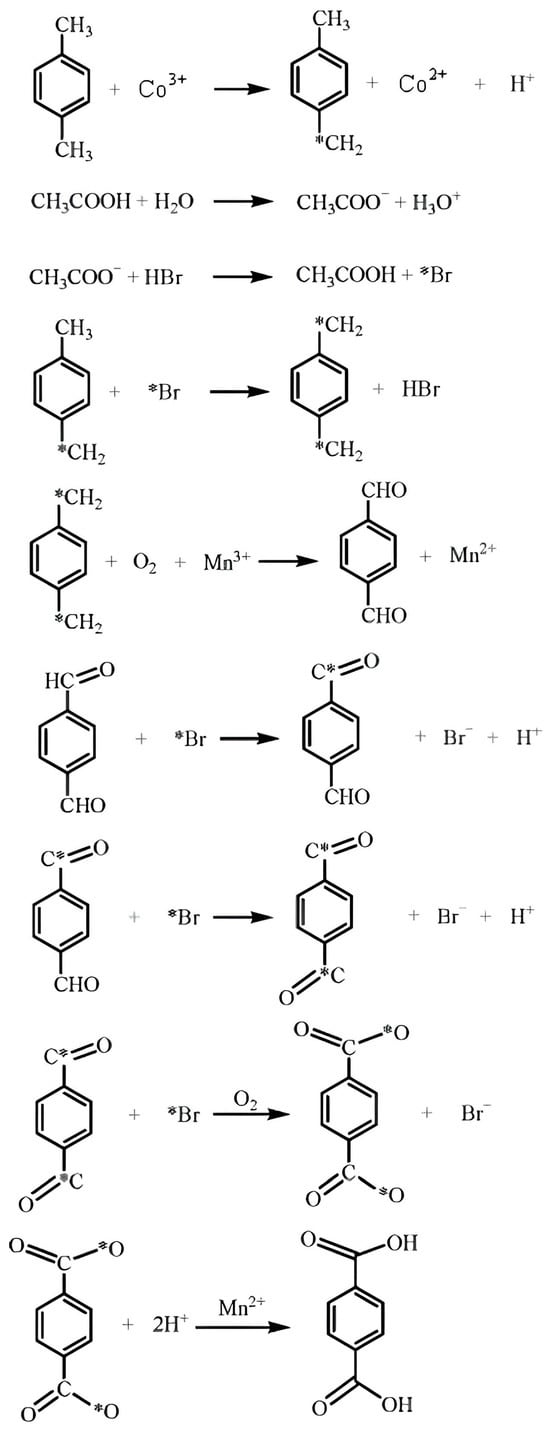 - Li, M.; Niu, F.; Busch, D.H.; Subramaniam, B. Kinetic investigations of p-Xylene oxidation to terephthalic acid with a Co/Mn/Br catalyst in a homogeneous liquid phase. Ind. Eng. Chem. Res. 2014, 53, 9017–9026. [Google Scholar] [CrossRef]