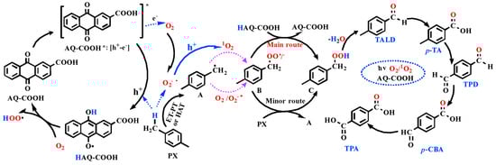 | TiO2 | heterogeneous | PX = 0.4 mmol, mTiO2 = 20 mg Vacetonitrile = 4 mL, VH3PO4 = 4 μL, O2 T = 25 °C, treaction = 1 h. light source = UV LED strip λ = 365 nm (15 W) | 15.2% | _ | [56] |