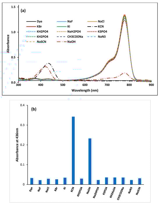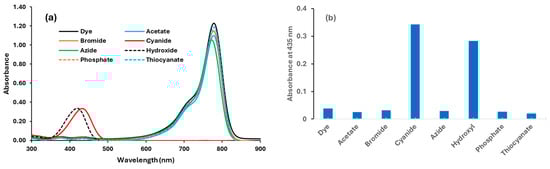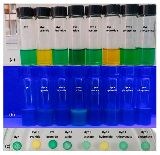Upon mixing the dye solution (50 μM) with 20 equivalents of the anions tested, an instant color change from green to yellow was observed with cyanide and hydroxide. Acetate, phosphate, and azide caused no significant change but exhibited a slight increase over time, as shown in Figure 1a. In contrast, other anions, such as bromide, chloride, iodide, fluoride, and thiocyanate, showed no change. On the other hand, only azide exhibited strong yellow fluorescence under a UV lamp with an excitation wavelength of 365 nm. Interestingly, these changes were instantaneous and visible, as shown under normal light and a UV lamp at 365 nm (Figure 1a,b). The color change was also demonstrated on cellulose disks, as shown in Figure 1c. As reported earlier, this reflects the dye’s capability as a selective colorimetric probe for cyanide and hydroxide [56]. The strong fluorescence due to azide has not been previously reported or investigated. The color change with azide became significant with time. The interaction of cyanide and hydroxide with the dye caused a dramatic decrease in the intensity of the strong absorption band at 780 nm and a concomitant band appearance at 435 nm, as shown in Figure 2. Other monovalent ions, including fluoride, chloride, bromide, iodide, dihydrogen phosphate, thiocyanate, acetate, and dihydrogen arsenate, caused no significant color or spectral changes.