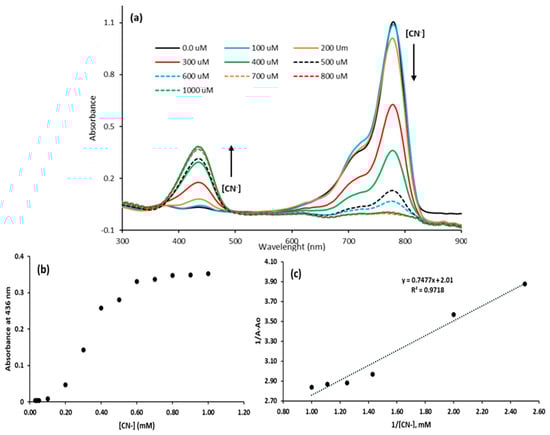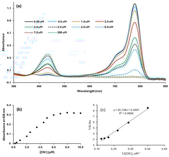 UV−Vis absorption spectra for cyanide titration with the dye (a). A plot of absorbance vs. cyanide concentration at 435 nm (b). The Benesi−Hildebrand plot (c).