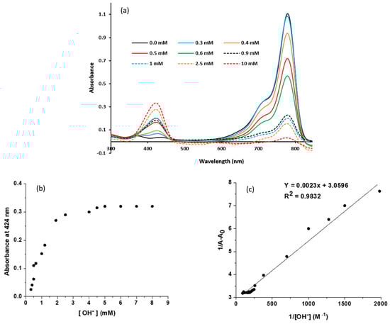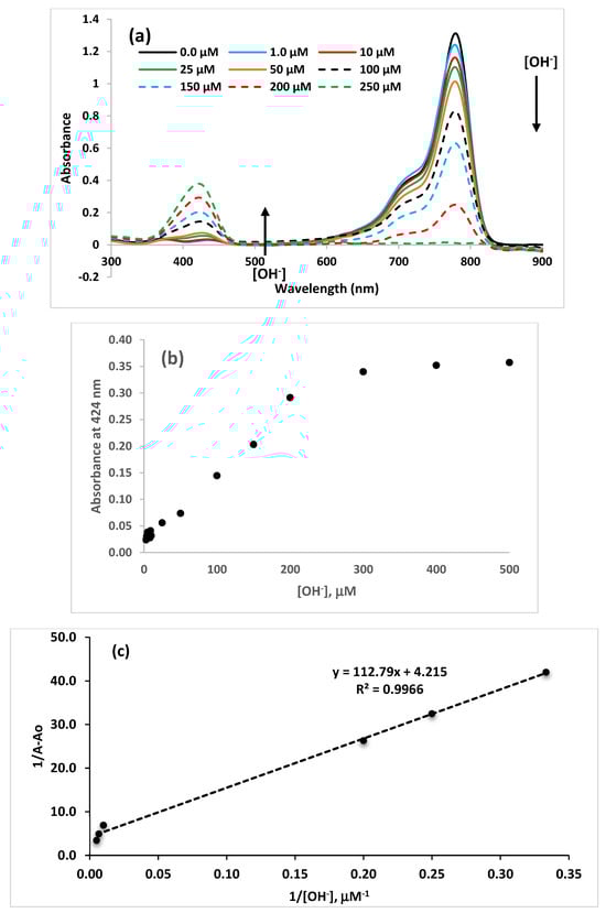 UV−Vis absorption spectra for the titration of the dye with hydroxide (a). A plot of absorbance vs. hydroxide concentration at 424 nm (b). The Benesi−Hildebrand plot (c).