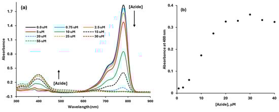 The UV−Vis titration of azide (0.75 µM to 55 µM) against the dye in 100% ACN (a). The azide absorbance at 400 nm from 0.75 µM to 55 µM (b).