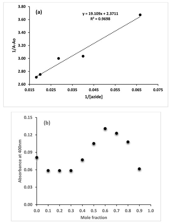 The dye was titrated with varying concentrations of azide in acetonitrile. The band at 400 nm increased while the band at 780 nm decreased. The absorbance was recorded after 20 min of reaction. The results are presented in Figure 6a,b. The Benesi–Hildebrand plot resulted in a binding constant of 1.14 × 105 M−1 (Figure 7a). Based on Job’s plot, a stoichiometry of about 1:1 was observed, as shown in Figure 7b. However, depending on the nucleophilic substitution reaction rates, the sensor may show a 1:1 or 1:2 stoichiometry ratio between the sensor and the azide ion.