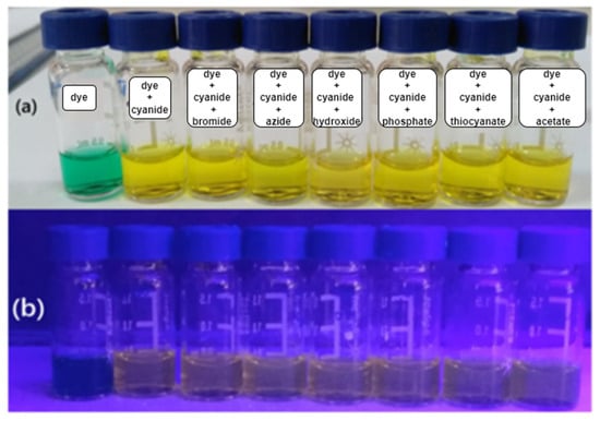 This study was performed in acetonitrile–water to study the effect of water on the sensitivity and selectivity of the dye for various anions (3:1, v/v). The dye concentration was maintained at 5.0 µM, and monovalent inorganic salts were dissolved in deionized water at 0.1 M for the investigation. A time lag of a few minutes was observed for the visual color change from green to yellow, specifically for cyanide and hydroxides, particularly at lower concentrations (Figure 9a). Additionally, no fluorescence was observed in the presence of water at 365 nm (Figure 9b). The selectivity for cyanide and hydroxide was enhanced, while sensitivity was reduced upon increasing the water content. It took a few minutes to achieve the intense color, indicating that the interaction was slower than that in pure acetonitrile, as shown in the UV-Vis results (Figure 10). The dye’s sensitivity to the anions diminished in the presence of water. Higher concentrations, approximately 100 times that of cyanide and approximately 700 times that of hydroxide, are needed to detect the ions compared to the concentration in 100% acetonitrile. The absorption readings were taken at 5 min.