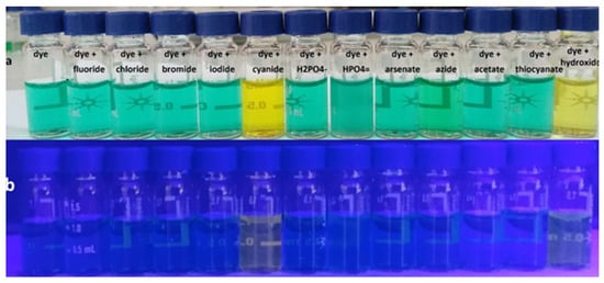 The effect of adding anions to the dye solution: the color change under normal light (a) and the fluorescence under a UV lamp at 365 nm (b) in a 75:25 (v/v) acetonitrile/water mixture. The order of vials in (b) is the same as in (a).