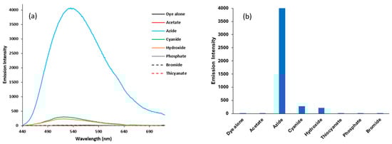 The fluorescence selectivity of the dye (5.0 Μm) was tested against different TBA salts (1.0 × 10−4 M) in 100% acetonitrile and for inorganic salts in 1% aqueous acetonitrile at an excitation wavelength of 430 nm. The dye exhibited strong emission at 535 nm upon excitation at 430 nm in the presence of 100 equivalents of TBA–azide. Weak emission spectra were observed at 521 nm and 523 nm for TBA-OH and TB-acetonitrile, respectively, in 100% acetonitrile, as shown in Figure 13a. The fluorescence was quenched with time for cyanide and hydroxide and enhanced in the case of azide. It is noteworthy that fluorescence quenches in 1% aqueous acetonitrile. The fluorescence intensity of the dye with different anions at 535 nm is presented in Figure 13b. These results strongly indicate that the dye is an excellent, sensitive, and selective sensor for azide. First, azide can be distinguished from cyanide and other ions using UV-Vis spectroscopy based on reaction time, as the color changes over time, due to its slower spectral response and color changes. Additionally, it is the only anion that exhibits strong fluorescence in anhydrous acetonitrile, whereas other ions show no significant fluorescence. The nucleophilic binding of the azide ion to the iminium group and the chlorine substitution on the dye may result in a fluorescence change. Also, the unique structure of azide and the presence of charge may contribute to structural change in the IR 780 dye molecule.