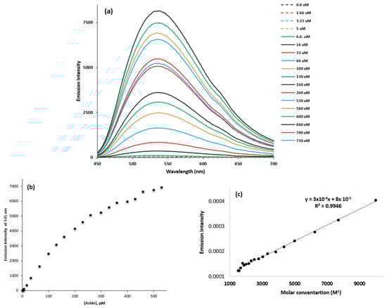 The dye (5.0 µM) was fluorescence-titrated with TBA–azide in acetonitrile at 535 nm (Figure 14a). As shown in Figure 14b, emission increases linearly with azide concentration. The binding constant, calculated according to the Benesi–Hildebrand equation, is 2700 M−1, as shown in Figure 14c.