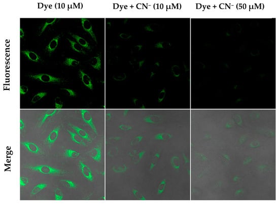 The IR-780 dye, at a concentration of 10 µM, was readily internalized by HeLa cells without affecting cell viability. Cells were seeded at a density of 2 × 104 cells per well in the #1.5 polymer coverslip µ-Slide 4 well chamber slides (Ibidi) and allowed to adhere overnight. The following day, the cells were incubated with 500 µL of 10 µM IR-780 dye for 30 min at 37 °C. Fluorescence imaging of the free IR-780 was captured using a confocal laser scanning microscope. Subsequently, the cells were treated with 10 µM and 50 µM CN⁻ for an additional 30 min, followed by further imaging [56,63]. As shown in Figure 18, fluorescence staining with IR-780 was highly specific to the cells, with the background (areas without cells, Figure S1) remaining non-fluorescent (black), even without washing off the probe. A significant decrease in fluorescence intensity was observed upon CN addition, indicating effective quenching of the dye’s emission. Moreover, the extent of fluorescence quenching was directly proportional to the CN⁻ concentration. These results demonstrate CN’s specific and concentration-dependent quenching effect on fluorescence within cells.