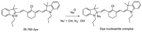 Cyanine dye IR 780 (Scheme 1) is a lipophilic dye with absorption and emission capabilities in the near-infrared (NIR) region. It is used in the bioimaging and therapy of different types of cancers [1,2,3,4,5]. It is highly effective in pre-clinical tumor detection and as a drug delivery agent, aiding in clinical planning for oncological surgeries. NIR dyes can harness their photothermal stability due to the absorbance in the NIR range, accompanied by concomitant heat emission. At the same time, its hydrophobicity is a limitation of its application. Based on their excellent photophysical properties, biocompatibility, and low toxicity, these compounds have applications in chemical sensing and detecting anions, cations, and biomolecules [6].