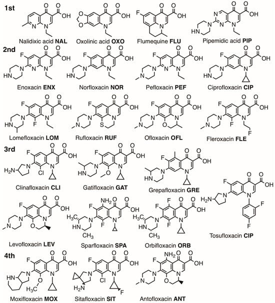 - Pham, T.D.M.; Ziora, Z.M.; Blaskovich, M.A.T. Quinolone Antibiotics. Med. Chem. Commun. 2019, 10, 1719–1739. [Google Scholar] [CrossRef]