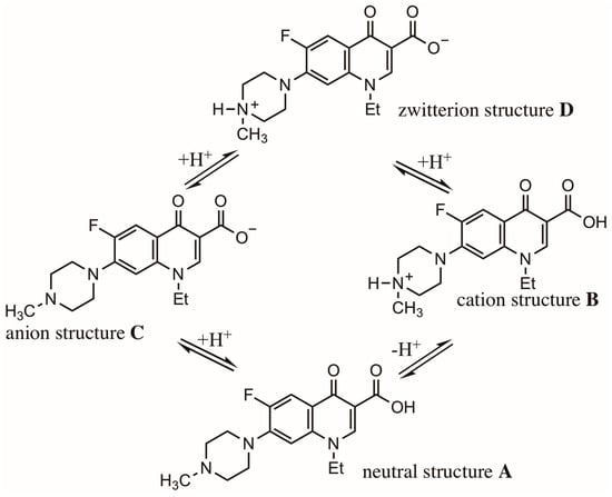 - Rusu, A.; Tóth, G.; Azocs, L.; Kökósi, J.; Kraszni, M.; Gyéresi, A.; Noszál, B. Triprotic site-specific acid-base equilibria and related properties of fluoroquinolone antibacterials. J. Pharm. Biomed. Anal. 2012, 66, 50–57. [Google Scholar] [CrossRef]