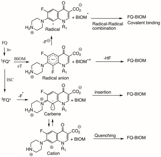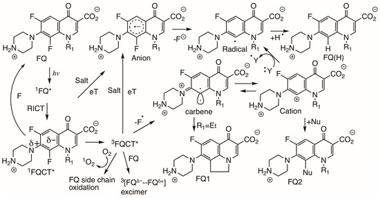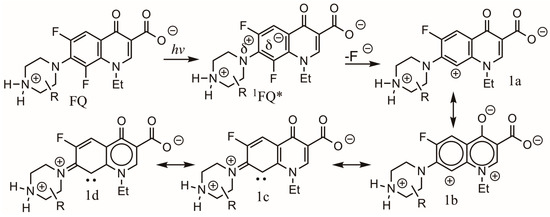 - Soldevilla, S.; Bosca, F. Photoreactivity of Fluoroquinolones: Nature of Aryl cations Generated in Water. Org. Lett. 2012, 14, 3940–3943. [Google Scholar] [CrossRef]