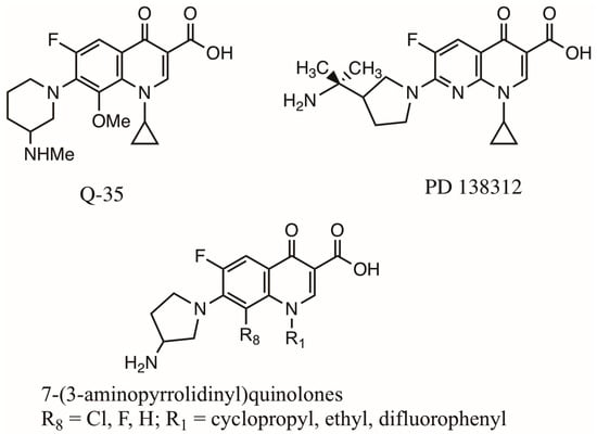 - Hagen, S.E.; Domagala, J.M.; Gracheck, S.J.; Sesnie, J.A.; Stier, M.A.; Suto, M.J. Synthesis and Antibacterial Activity of New Quinolones Containing a 7-[3-(1-amino-1-methylethyl)-1-pyrrolidinyl] Moiety. Gram-Positive Agents with Excellent Oral Activity and Low Side Effect Potential. J. Med. Chem. 1994, 37, 733–738. [Google Scholar] [CrossRef]