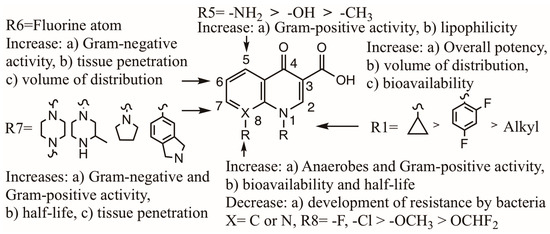 - Peterson, L.R. Quinolone Molecular Structure-Activity Relationships: What We Have Learned about Improving antimicrobial Activity. Clin. Infect. Dis. 2001, 33, S180–S186. [Google Scholar] [CrossRef]
