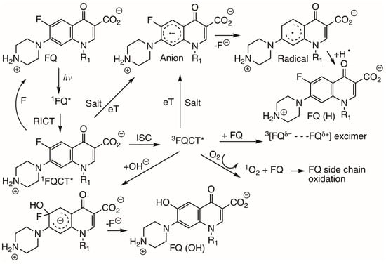 - Bano, R.; Anwar, Z.; Mustn, N.; Ahmad, I. Photochemistry of Fluoroquinolones: A Review. Baqai J. Health Sci. 2017, 1, 1–22. [Google Scholar]