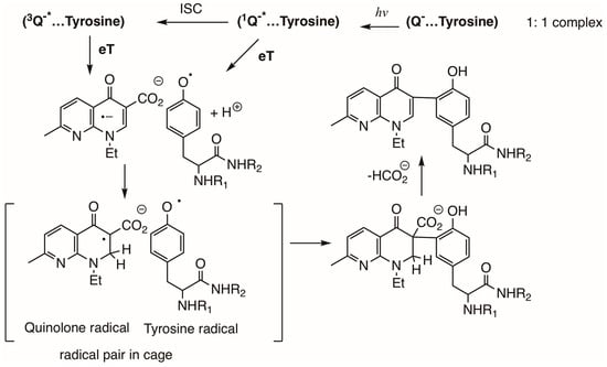 - Vermeersch, G.; Ronfard-Haret, J.C.; Bazin, M.; Carillet, V.; Morliere, P.; Santus, R. Type I and Type II Photosensitization by the Antibacterial Drug Nalidixic Acid. A laser Flash Photolysis Study. Photochem. Photobiol. 1991, 54, 661–666. [Google Scholar] [CrossRef]