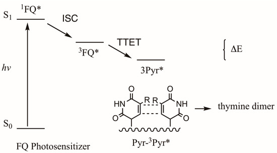 - Lhiaubet-Vallet, V.; Cuquerella, M.C.; Castell, J.V.; Bosca, F.; Miranda, M.A. Triplet excited fluoroquinolonas as mediators for thymine cyclobutane dimer formation. J. Phys. Chem. B 2007, 111, 7409–7414. [Google Scholar] [CrossRef]