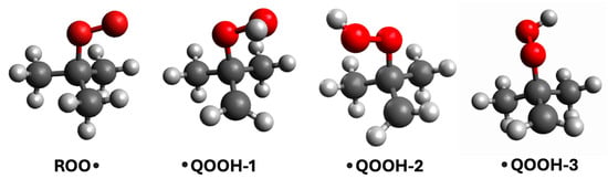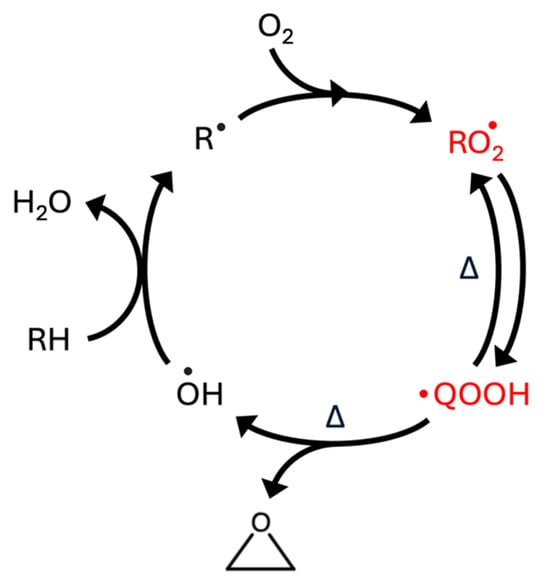 Fuel combustion begins with the oxidation of hydrocarbons (RH) to form reactive hydrocarbon (R•) radicals [1,2,3]. These R• radicals promptly react with atmospheric O2, generating alkylperoxy (ROO•) radicals, which typically isomerize via H-atom migration to form hydroperoxyalkyl (•QOOH) radicals [2,3]. This process is summarized in Figure 1.