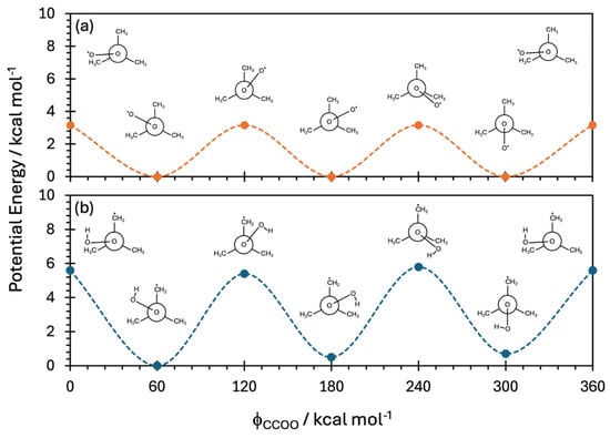 Figure 2 presents the molecular structure associated with the ground-state minimum energy geometry of ROO. As expected, the minimum energy geometry shows a staggered conformation of the terminal oxygen relative to the methyl substituents. This conformation is reminiscent of the expected stereochemistry of alkanes in which the staggered configuration is favored. This geometry is reinforced by Figure 3, which presents the potential energy (PE) profiles connecting the equivalent staggered conformations of ROO as illustrated by the associated Newman projections at the minima. As evident in this figure, rotation about the C-O bond (fCCOO), connecting two equivalent staggered conformations, traverses a geometry in which the terminal oxygen eclipses a methyl substituent. As is well known and confirmed by Figure 3, the eclipsed conformation is a saddle point along the PE surface. The PE barrier along nuclear motions corresponding to staggered-to-eclipsed transformation is ~3.15 kcal mol−1, precluding free rotation around the C-O bond at tropospherically relevant temperatures (~220–290 K) and minimal free rotation at low-temperature combustion temperatures (500–700 K).