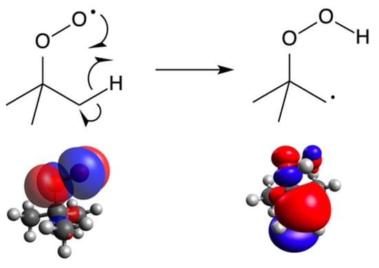 As noted in the introduction, intramolecular hydrogen-atom migration from an alkyl group adjacent to the terminal oxygen is a competitive unimolecular decay route for ROO in low-temperature combustion conditions as well as for a subset of atmospherically relevant peroxy radicals—particularly those derived from the atmospheric oxidation of isoprene. In our prototypical ROO, the tert-butyl peroxy radical, 1,4-hydrogen migration forms a 2-hydroperoxy-2-methylprop-1-yl (QOOH) radical, inevitably shifting the singly occupied molecular orbital (SOMO) that carries the unpaired electron (see Figure 4). Unlike ROO, the inherent asymmetry of the nascent QOOH leads to three distinct staggered conformations, as illustrated in Figure 2. The relevant conformer formed following hydrogen-atom migration is QOOH-1, as it is the lowest energy staggered conformation. The latter is seen clearly in Figure 3b, which presents the PE profiles associated with the fCCOO coordinate of QOOH—the coordinate that connects the three distinct staggered conformations. As evident from these PE profiles, the QOOH-2 and QOOH-3 conformers are, respectively, ~0.5 kcal mol−1 and ~0.7 kcal mol−1 less stable than QOOH-1, consistent with the results of Hansen et al. [76]. The relative stability can be understood by recognizing the loss of hydrogen-bonding found in QOOH-1 between the terminal H-atom of the hydroperoxy group and the SOMO lone electron.