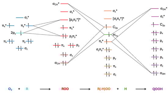 Schematic of the change in molecular orbitals upon the R + O2 reaction to form ROO, as well as its subsequent rearrangement to form QOOH.
