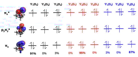 The D1 state of QOOH-2 is a complicated mixture of several electronic configurations, with the Ψ7 and Ψ8 configurations identified as the largest contributors. These configurations are doubly degenerate equivalents, distinguishable by the spin symmetry of the odd electron in the SOMO and LUMO. This observation aligns with near equal contribution of the Ψ7 and Ψ8 configurations. Formation of the Ψ7 and Ψ8 electron arrangements most likely involve a HOMO to LUMO transition from the Ψ1 configuration—manifesting in a 2p n transition. Given that the participating orbitals in the dominant transition are orthogonal, their poor spatial overlap manifests in zero oscillator strength for the D1 D0 transition given in Table 1.