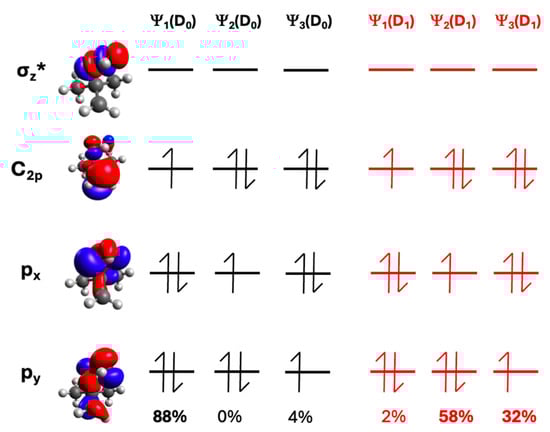 Electronic structure contributions to the D0 (black) and D1 (red) states of QOOH-3.