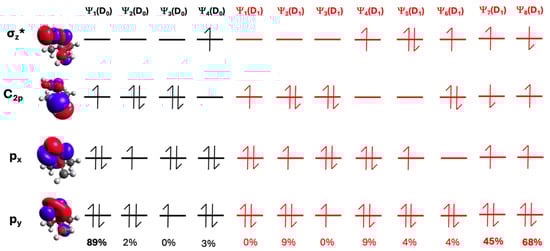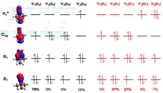 Figure 8 illustrates the highest four contributing electronic configurations of the D0 and D1 states of QOOH-2. As with QOOH-1, the D0 state involves an electronic configuration that is ~90% Ψ1—with minor contributions from Ψ2 and Ψ3 configurations. Unlike QOOH-1, a new electronic configuration—Ψ4—has a minor contribution to the electronic structure of ground-state QOOH-2. Although a minor component, an increased % contribution of the Ψ4 configuration may be understood by visualizing the SOMO and LUMO of QOOH-1 (Figure 7) and QOOH-2 (Figure 8) and recognizing that while the electron density distribution of the SOMO and LUMO is primarily localized around the 2p and σ*OO orbitals, respectively, they each contain a minor component attributable to the orbital character of its partner pair. This implies that upon QOOH-1 to QOOH-2 transformation, the SOMO and LUMO orbitals couple, which is plausibly explained by the smaller energy difference between SOMO and LUMO (0.46 EH for QOOH-1 and 0.21 EH for QOOH-2) and thus an increased contribution from electronic configurations that involve electron promotions to LUMO.