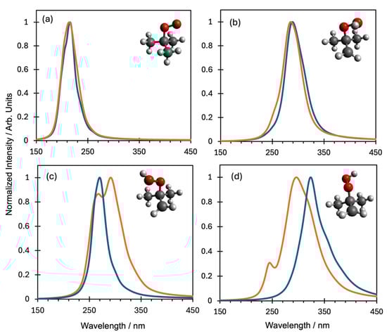 and , me and e are the mass and charge of the electron, respectively, while c is the speed of light. The internal sum in Equation (1) is expressed over the set of total geometries (NTOT = 500) while the external sum includes transitions from the initial state i (the ground state) to final state j (i.e., S1, S2, S3, …, SM etc.) with respective oscillator strength as given by Equation (3). δ is a broadening factor, which is arbitrarily set to 0.2 eV for each of the calculated absorption profiles reported herein. All CASPT2 and CCSD(T) calculations were performed in Molpro [95,96], while the DFT computations were undertaken in Gaussian 16 [97].