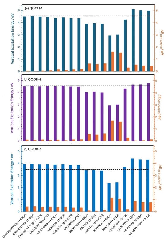 Analogous benchmark studies were undertaken on the three QOOH conformers. Table 2, alongside Figure 11, lists and pictorially illustrates the VEEs of the various DFT functional/basis set combinations and their deviations from the benchmark CASPT2 level. Inspecting both Table 2 and Figure 11, the performance of the TDDFT-derived VEEs is heavily conformer-dependent. For QOOH-1, VEEs calculated with functionals corrected for long-range correlation (e.g., CAM-B3LYP, ωB97XD, etc.) appear to provide better agreements with the CASPT2-derived VEE, although LC-BLYP shows an over-estimation of the VEE. This latter observation indicates the importance of including Hartree–Fock exchange in the components of the functional. Computing the VEEs using CAM-B3LYP on the equivalent AIMD-derived structures yields the orange electronic absorption profile displayed in Figure 10b, which shows excellent agreement with the CASPT2 electronic absorption profile. Conversely, the CAM-B3LYP electronic absorption profiles for QOOH-2 and QOOH-3 (Figure 10c,d, respectively) are in noticeably poorer agreement with the CASPT2-derived profile. Upon inspecting Table 2 and Figure 11, all DFT functionals underestimate the VEE (cf. CASPT2), except for LC-BLYP. In contrast, all DFT functionals overestimate the VEE (cf. CASPT2), except for the PBE- and B3LYP-based functionals. Interestingly, as Figure 7, Figure 8 and Figure 9 indicate, there is a progressive increase in the multi-reference character of the ground state. Moreover, the D1 state of QOOH-2 involves a significant mixing of electronic configurations that corresponds to doubly excited configurations (Ψ7 and Ψ8), when viewed from the dominant ground-state configuration Ψ1. Given the inherent inability of linear-response DFT to describe double excitations, it is unsurprising that the electronic absorption profiles and VEE are in poor agreement with CASPT2. We also note that the TDDFT simulated absorption profile of QOOH-2 (and to a lesser extent, QOOH-3) is bimodal, which arises via the inability of adiabatic TDDFT to describe double excitations. As illustrated in Figure 8, the leading electronic configurations involve double excitations while the highest single excitation contributions are from configurations Ψ2 and Ψ4—both of which contribute 9%. The bimodal character in QOOH-2 is a manifestation of the interplay between these single excitations with subtle changes in geometry in the AIMD ensemble. Future studies will involve modified TDDFT methods, such as spin-flip TDDFT, to describe double excitations.