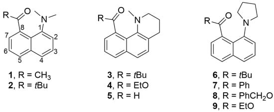- Einspahr, H.; Robert, J.B.; Marsh, R.E.; Roberts, J.D. Peri Interactions: An X-Ray Crystallographic Study of the Structure of 1,8-Bis(Dimethylaminonaphthalene). Acta Crystallogr. B Struct. Crystallogr. Cryst. Chem. 1973, 29, 1611–1617. [Google Scholar] [CrossRef]