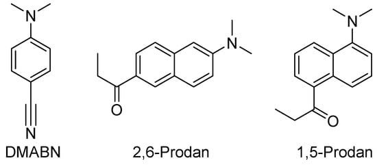 - Lobo, B.C.; Abelt, C.J. Does PRODAN Possess a Planar or Twisted Charge-Transfer Excited State? Photophysical Properties of Two PRODAN Derivatives. J. Phys. Chem. A 2003, 107, 10938–10943. [Google Scholar] [CrossRef]