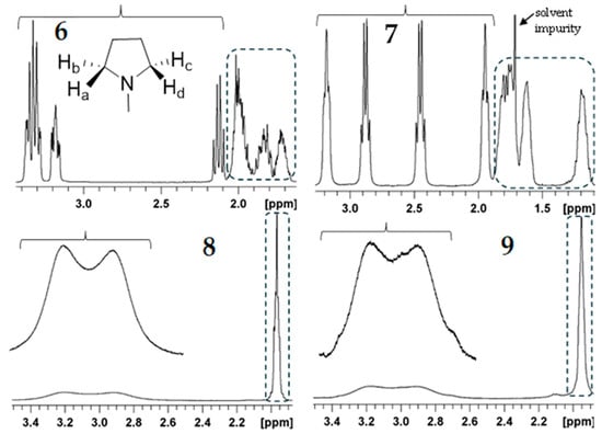 Partial 1H NMR spectra of 6 (top left), 7 (top right), 8 (bottom left), and 9 (bottom right) highlighting the pyrrolidine hydrogen resonances Ha–Hd under the brackets. The other four pyrrolidine hydrogen resonances are indicated in the dashed boxes.